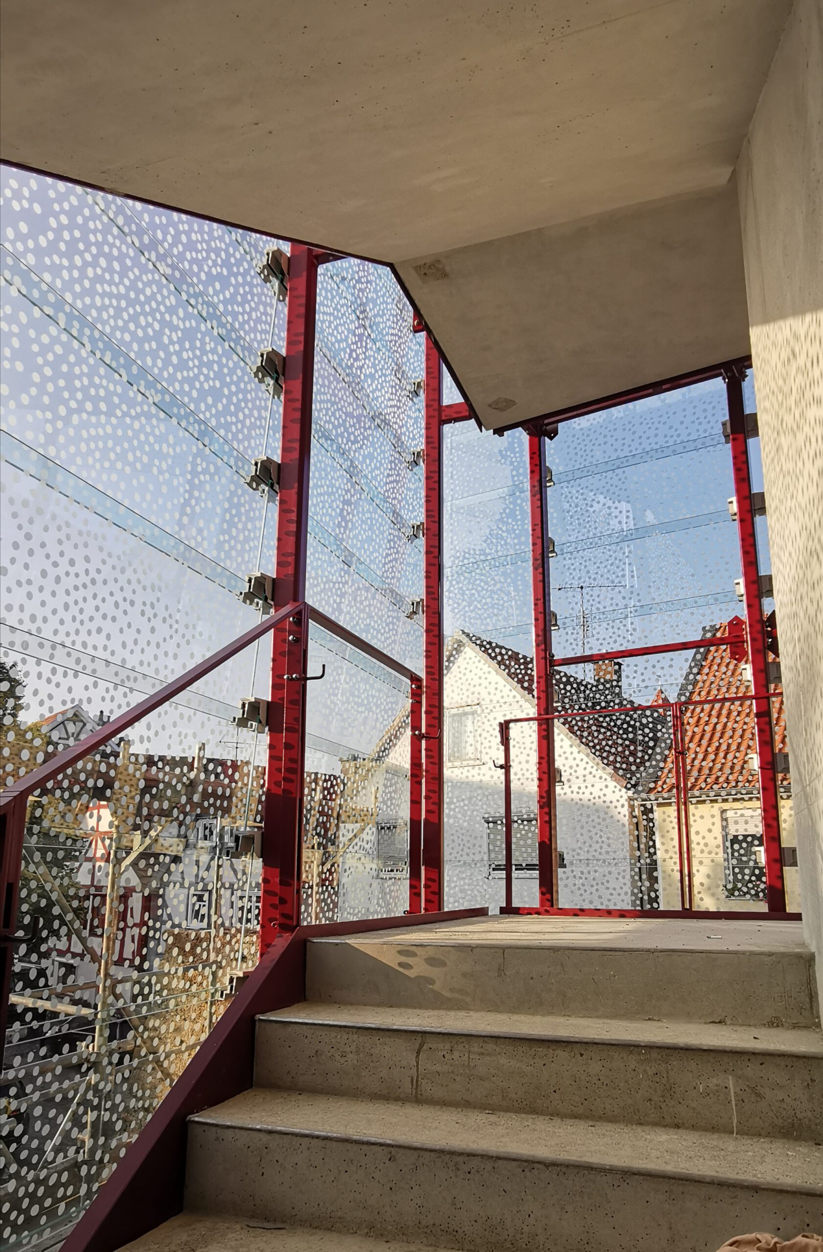 Im Vordergrund der Maßnahme steht die behindertengerechte Überarbeitung der Innenräume sowie die Errichtung eines Fluchttreppenturmes, der mit Stegen an das Gebäude angeschlossen wird. Die Innenraum-Konzeption sieht vor, alle nachträglichen Einbauten bis auf die statisch relevanten Bauteile, auszubauen.
