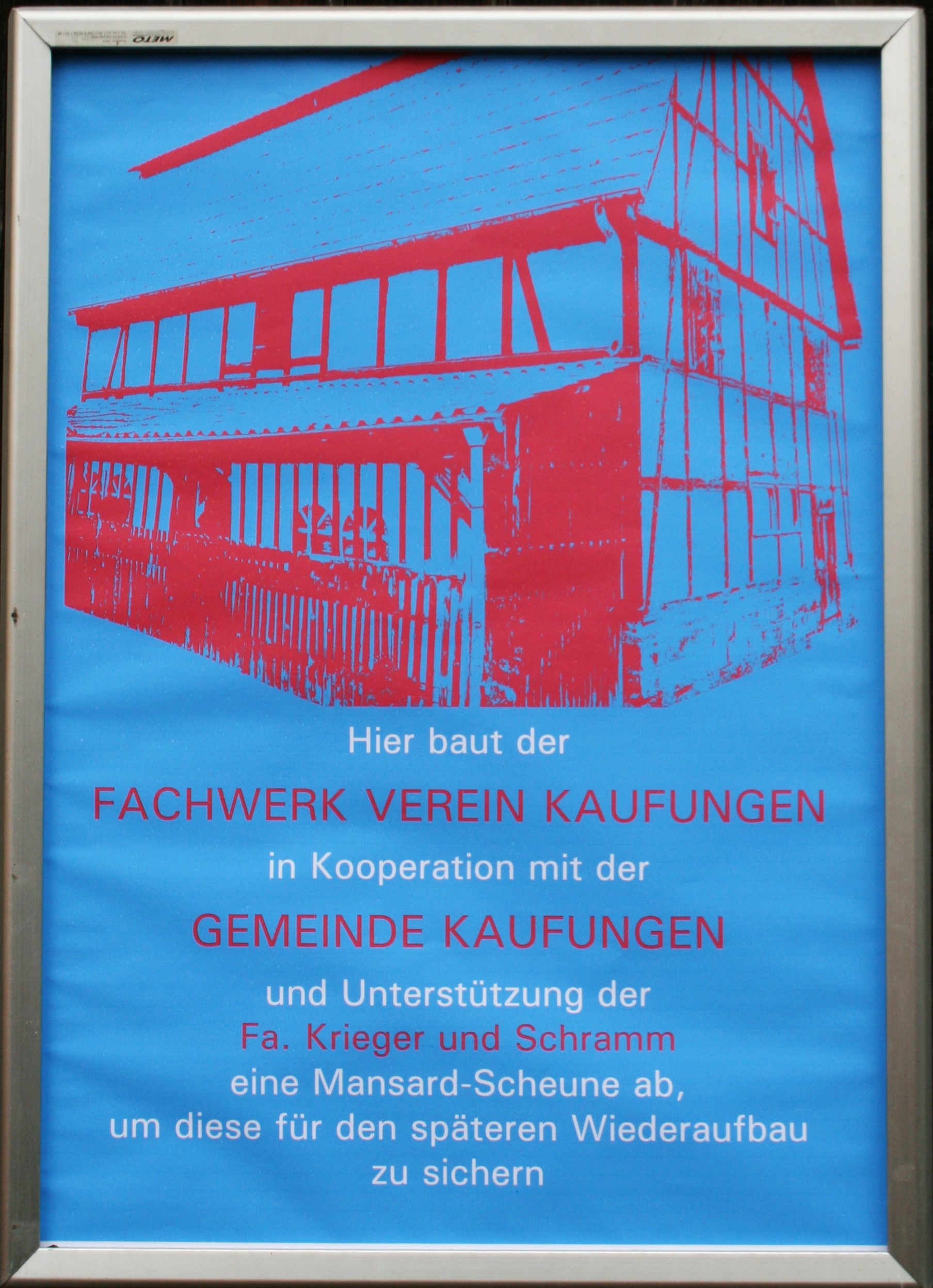 Für einen Neubau sollte im historischen Ortskern von Oberkaufungen eine Mansardscheune abgerissen und entsorgt werden. Der Fachwerkverein Kaufungen entschied sich, diese Scheune zu demontieren, einzulagern und sie auf einem geeigneten Grundstück als Fachwerkberatungszentrum wieder zu errichten. Dabei wurden die vorhandenen Balken und auch die Ausfachung eingelagert und wiederverwendet.