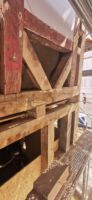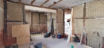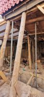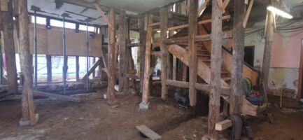 Nach einem Wasserschaden im Februar 2021 wurde entschieden die geschädigte Gaststätte sowie die darüberliegende Pension grundlegend zu sanieren. Dabei wurde auch das Nachbarhaus mit einbezogen. Über die Jahre hat sich im Bereich der Fachwerkkonstruktion ein großer Sanierungsstau ergeben, der jetzt in Ordnung gebracht wird. Dies betrifft in erster Linie die Erdgeschosse, die aufgrund aufsteigender Feuchtigkeit stark geschädigt sind. Ebenso die Dachfläche, die im Zuge der Sanierung komplett erneuert wird.